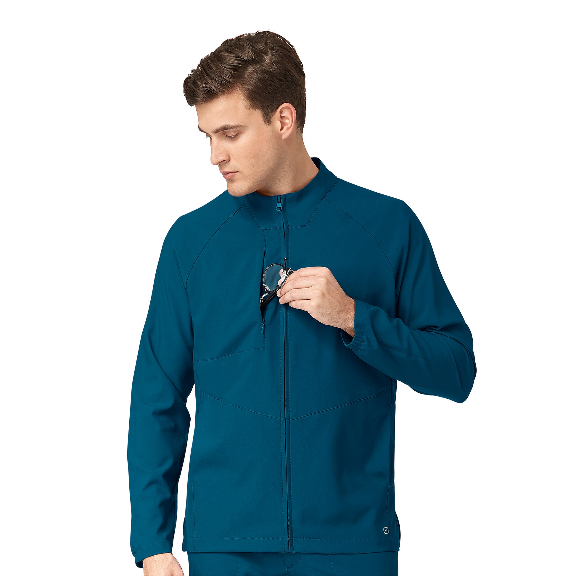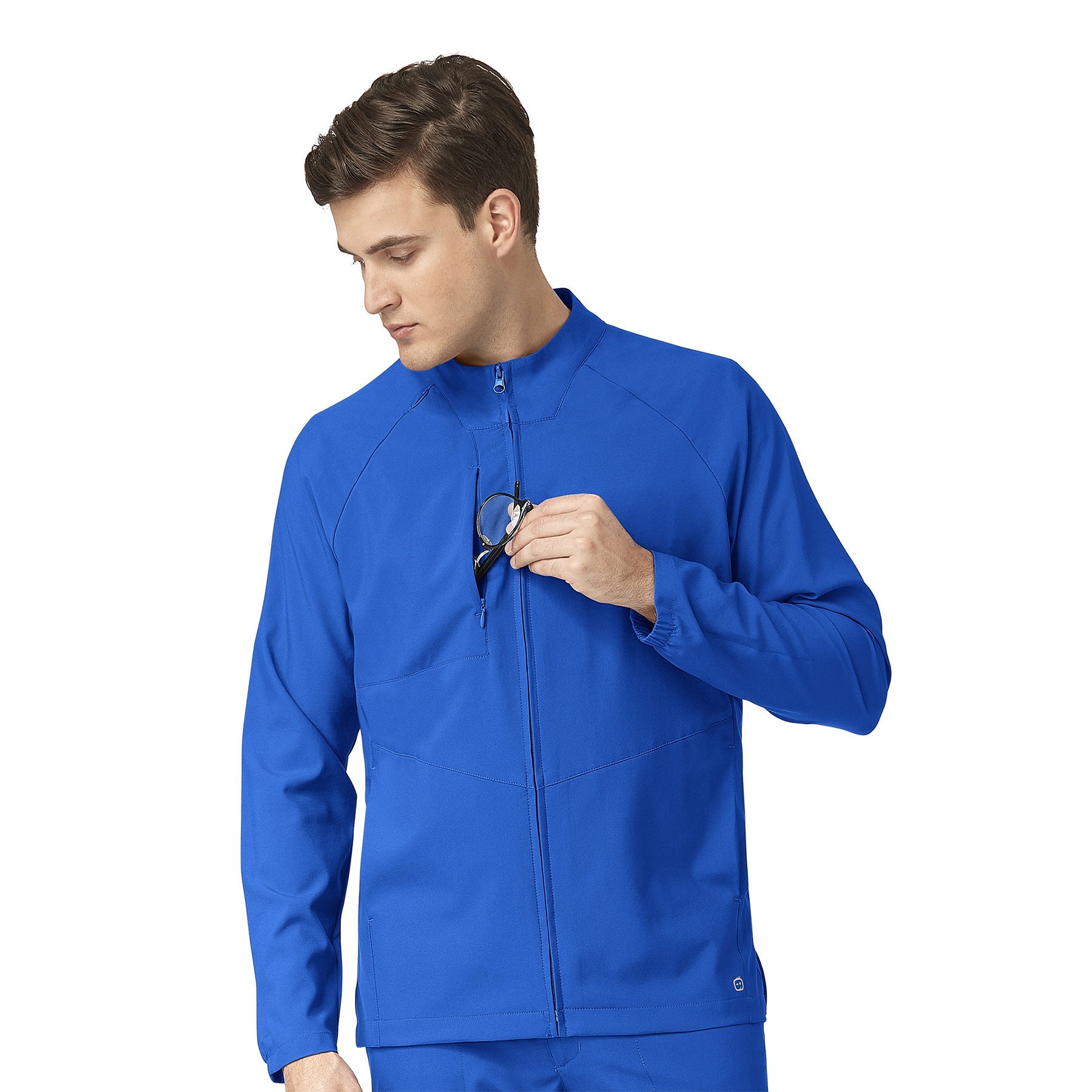 The Mens Zip Front Scrub Jacket from WonderWink W123 scrubs collection is a lightweight essential fleece scrub jacket designed to work for you. With features you love and trust like the badge loop at the shoulder seem, the side entry pockets and a zip front closure this scrub jacket will work for you. The sleeve hems have a back elastic that helps them to stay-put when you slide them up. The chest pocket is large enough for a tablet and the back vents keep things comfortable around the waistline. All around it's a comfortable mens scrub jacket you'll want working for you. Badge Loop at shoulder seam |Side entry chest pocket |Side entry front pockets |Back elastic at wrists |Back vents at hem