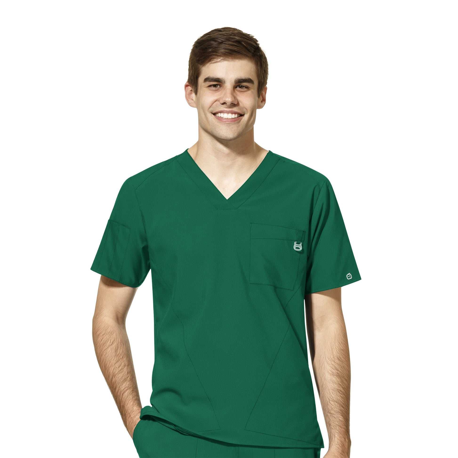 This awesome men's V-neck combines the utility of a scrub top with a look from a designer. Deco stitching with stylized and symmetrical lines throughout. W1 distinctive silhouettes tailored for all shapes and sizes, W2 leading edge micro-fiber technology fabric, W3 functional utility using spacious pockets, multiple accessory loops creates superb organization.WonderWink Branded Silicone Ring Left Chest Pocket|Side Seam Entry Front Pockets |Right Shoulder Badge Loop |Reflective Tape at Back Neck |4 Inch Side Seam Vents at Hem |WonderWink Logo Wearers Left Sleeve |100% Mechanical Stretch Polyester