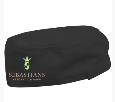 Beanie cap with mesh top and self-fastening closure is a kitchen essential and comfortable to wear. Embroiders well.